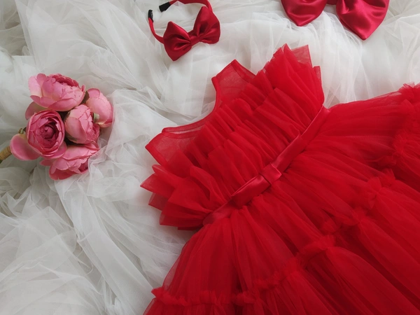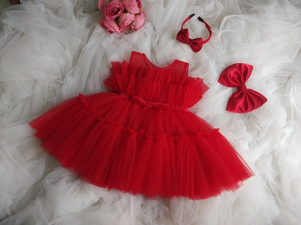 Bekted Bow Ruffked Partywear Red Dress