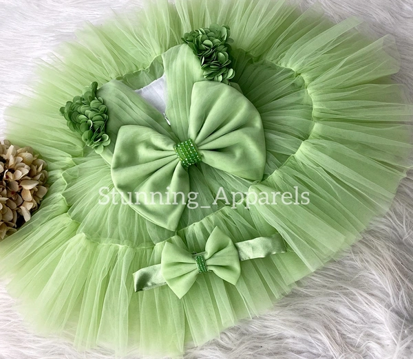 Cape Sleeves Flower Work Ruffled Pista Green Dress
