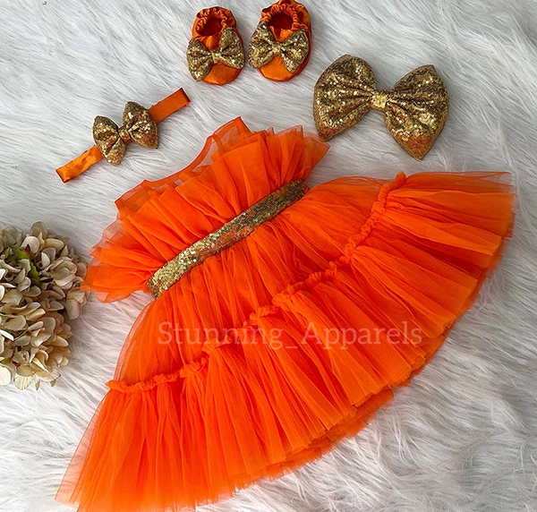 Golden Sequins Bow Ruffled Orange Dress