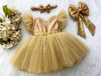 Golden Sequins Bow Ruffled Sleeves Golden Dress