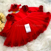 Long Sleeves Red Flower Work Red Partywear Frock