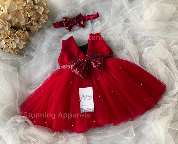 Maroon Sequins Bow Pearls Work Red Partywear Frock