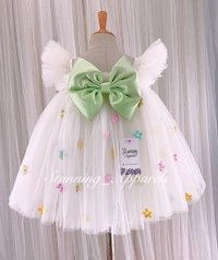 Multi Colors Flower Work Pista Satin Bow Umbrella White Frock