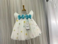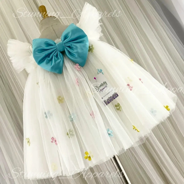 Multi Colors Flowers Work Blue Satin Bow Partywear White Frock