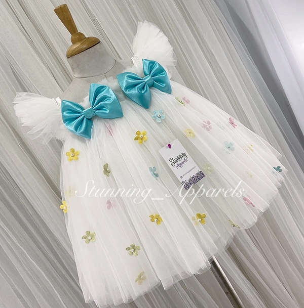 Multi Colour Flower Work Blue Satin Bow White Dress