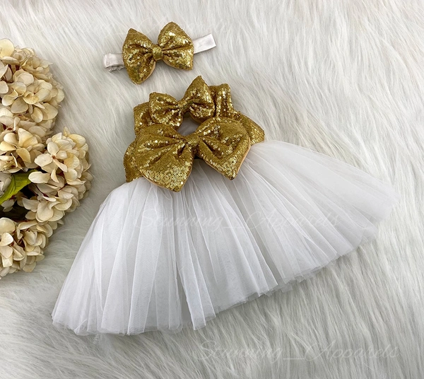 New Golden Sequins Double Bow White Party Wear