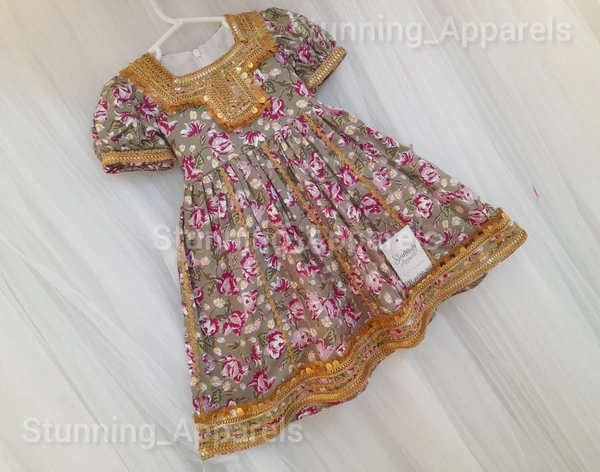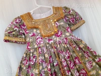 New Traditional Flower Printed Golden Matalic Lace Work Frock