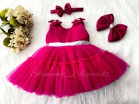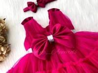 Shoulder Bow Party Wear Ruffled Magenta Dress