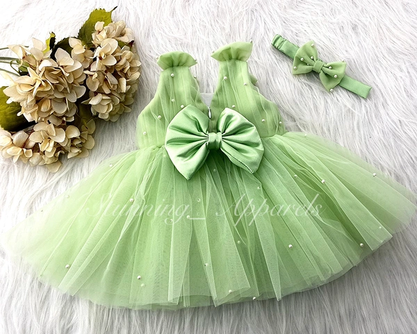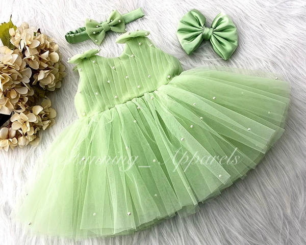 Shoulder Bow Pearls White Party Wear Pista Green Frock