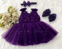 Shoulder Bow Pearls White Party Wear Purple Frock