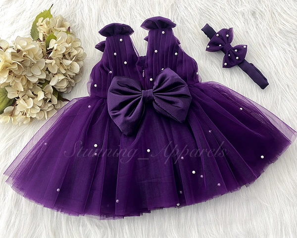 Shoulder Bow Pearls White Party Wear Purple Frock