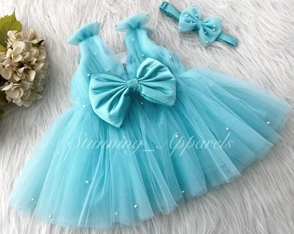 Shoulder Bow Pearls White Party Wear Sky Blue Frock