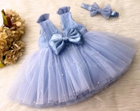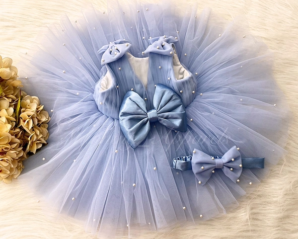 Shoulder Bow , Pearls Work Cute Party Wear Pastel Blue Frock