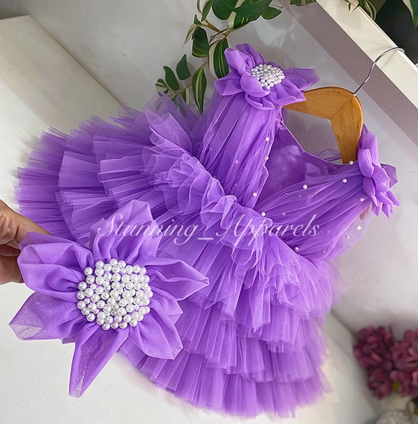 Shoulder Flower Work Layered Light Lavender Dress