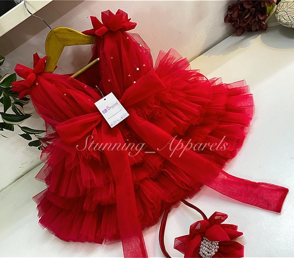 Shoulder Flower Work Layered Red Dress