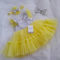 Silver Sequins Bow Partywear Lemon Yellow Frock
