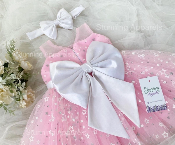 Stylish White Satin Bow Partywear Baby Pink Dress