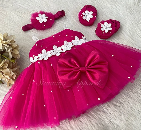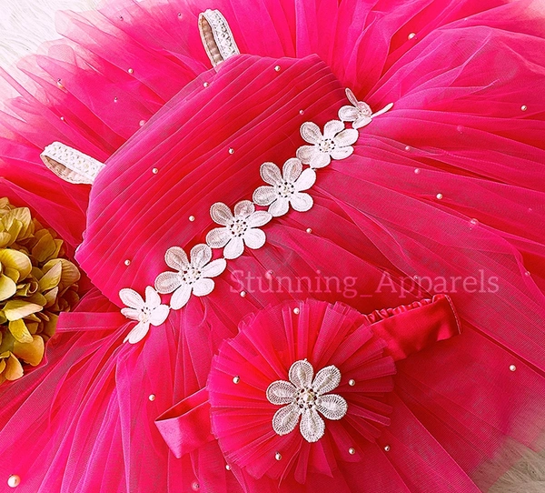 Waistline White Flower Work Magenta Pink Dress