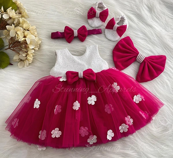 White Flower Work Magenta Pink Partywear Frock