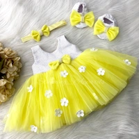 White Flower Work Partywear Yellow Frock