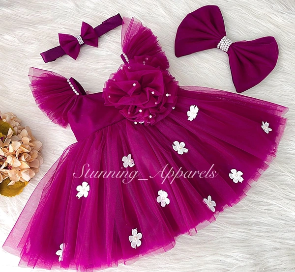 White Flower Work Strapped Ruffled Sleeves Datk Mahenta Pink Dress